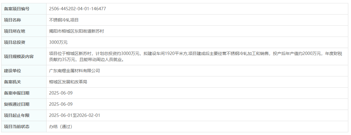 2025年6月9日,揭陽市榕城區東陽街道新蘇村不銹鋼冷軋項目備案復核獲通過。